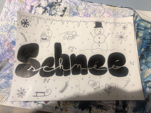 Die Schülerinnen und Schüler reisten gedanklich ins Hochgebirge (Schattierungsübung Gebirgsgrat) und in die Straßenschluchten von Manhattan (Aufgabe zur Fluchtpunktperspektive). Auch die persönlichen Eindrücke des fantastischen Winterwetters im Januar kamen nicht zu kurz (Kombiniere Schrift und Skizzen).